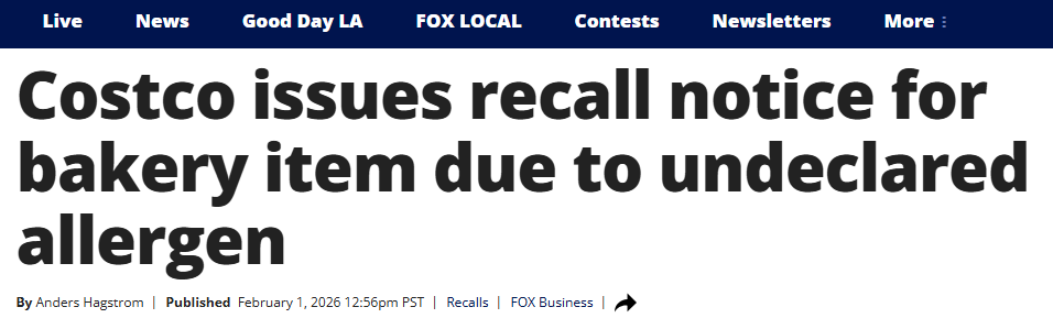 Costco近日发布召回通知,涉及部分因标签标注错误、可能引发顾客过敏反应的烘焙食品。