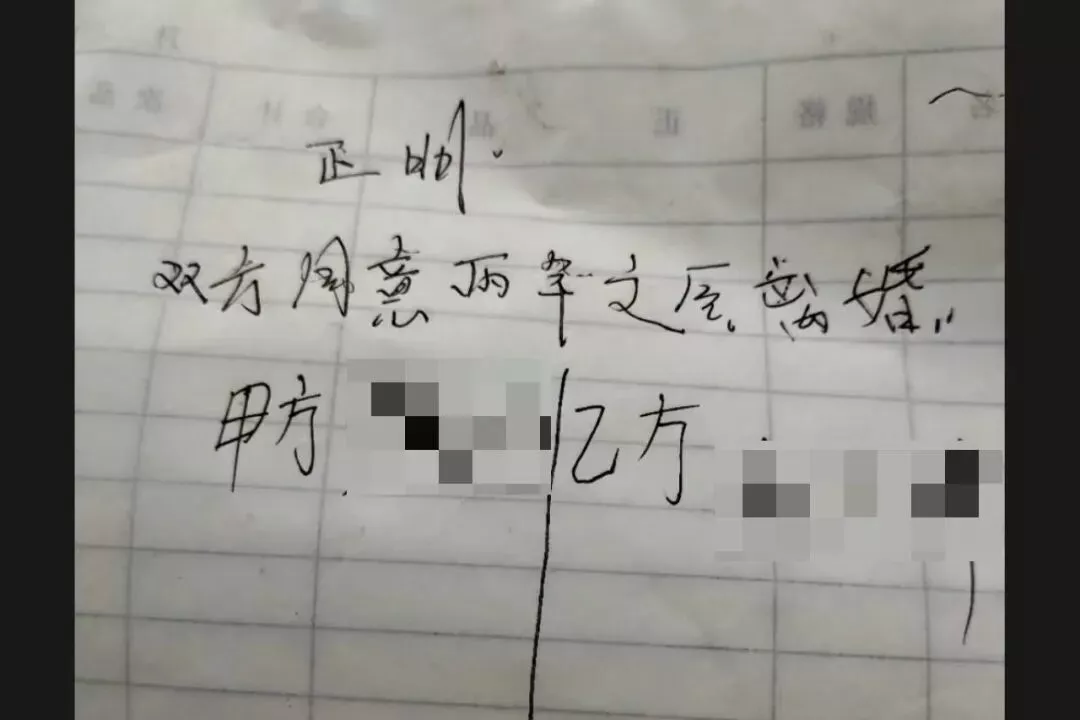 回家没两天,2021年4月19日,燕子要求立下字据。在一张废纸的背面,两人用歪歪扭扭的字迹,写下甲方乙方的姓名,确立了这场婚姻存续的原则:“正(证)明:双方同意两年之后离婚。”