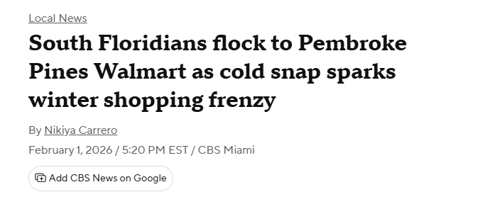 周六,在Pembroke Pines沃尔玛购物的民众表示,受寒冷天气影响,大家提前采购,为即将到来的低温做好准备。购物者Vernice Doyle接受采访时说:“我来买条牛仔裤和一件毛衣。然后我打算待在家里,用Instacart点外卖。”