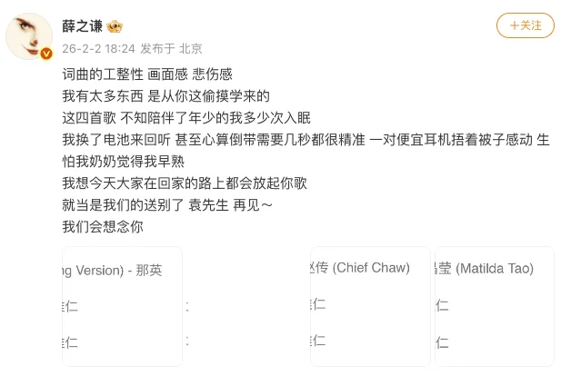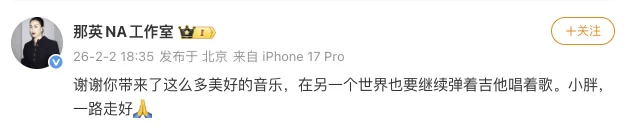 2月2日,中国台湾著名音乐人袁惟仁(小胖老师)因病逝世,享年57岁,其家属发布讣告确认消息,随后多位音乐界人士及公众通过社交媒体表达哀思。老狼以简短英文“R.I.P小胖”表达痛惜,并转发其音乐生涯回顾视频。 张宇在社交媒体转发病逝消息及家属悼文,附文"我们爱的小胖今天离开我们了.... 游鸿明引用合作歌曲《离家500里》歌词悼念:“小胖这次离家不只500里了,所有年少时的开心,悲伤就此落幕”。吉克隽逸形容其“去向更自由的地方”,称音乐结缘的时光已成永恒念想。 黄韵玲,陈子鸿等音乐人亦发文“一路好走”,感念其亦师亦友的情谊。