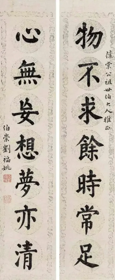 刘福姚传世作品不多,以榜书、对联、书信手札为主,精于行、楷,以“笔法精严,雅逸藏锋”著称。楷书起笔多藏锋逆入如“锥画沙”,长横圆融,行至中段转为方劲,收笔轻顿不张扬,比馆阁体多份书卷气。