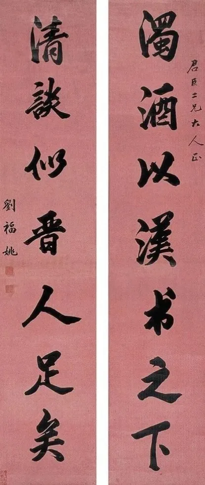 墨法浓淡匀净,偶见苍润。楷书通篇用油烟墨,色如漆光,笔画边缘洁净;行草长笔画末端偶现飞白,墨色变化随笔势自然生发,无刻意雕琢的匠气,尽显笔酣墨畅的书写本真。李慈铭《越缦堂日记》评其“楷法冠晚清,得晋人韵,破馆阁之滞”;沙孟海认为刘福姚的字“以帖养馆阁,雅而不媚,实为晚清书坛一重镇”。