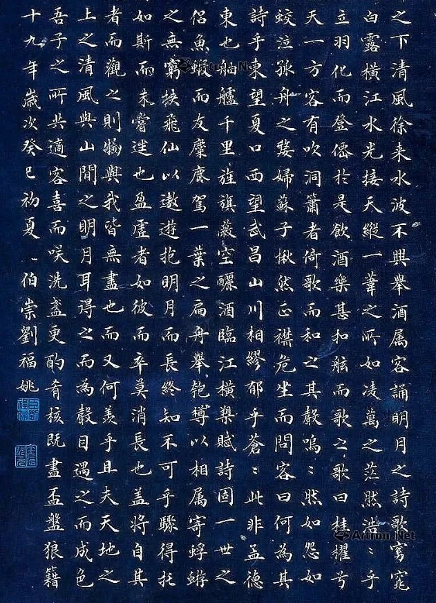 刘福姚在父亲的指点下学书,初临摹颜真卿《颜家庙碑》《多宝塔碑》,同时为了应付科举,又学欧阳询《九成宫》与“馆阁体”。不过他没有被“馆阁体”所拘囿,而是始终以欧、颜笔法为正宗,得唐人精髓,他将“欧楷”的笔力与“颜楷”的宽博融合,形成个性。