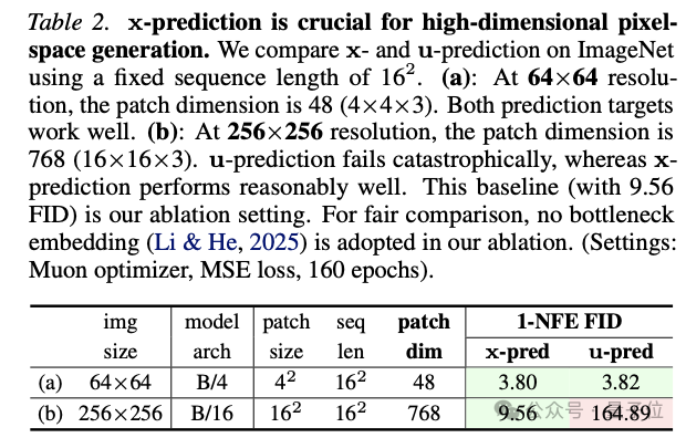 在真实的ImageNet实验中也是如此:256×256分辨率下,patch维度达到768(16×16×3),u-prediction的FID直接飙到164.89,而 x-prediction则保持在个位数。