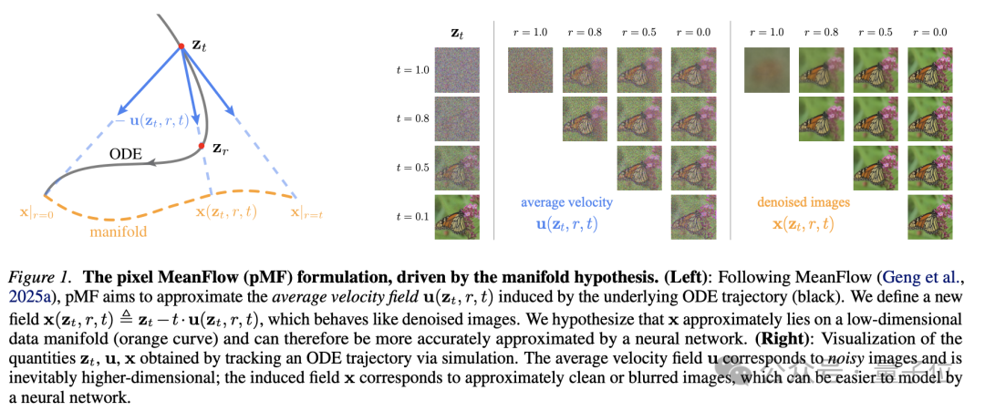 论文通过追踪ODE轨迹进行可视化发现,平均速度场u对应的是噪声图像,而变换后的x场则对应近乎干净或略微模糊的图像。