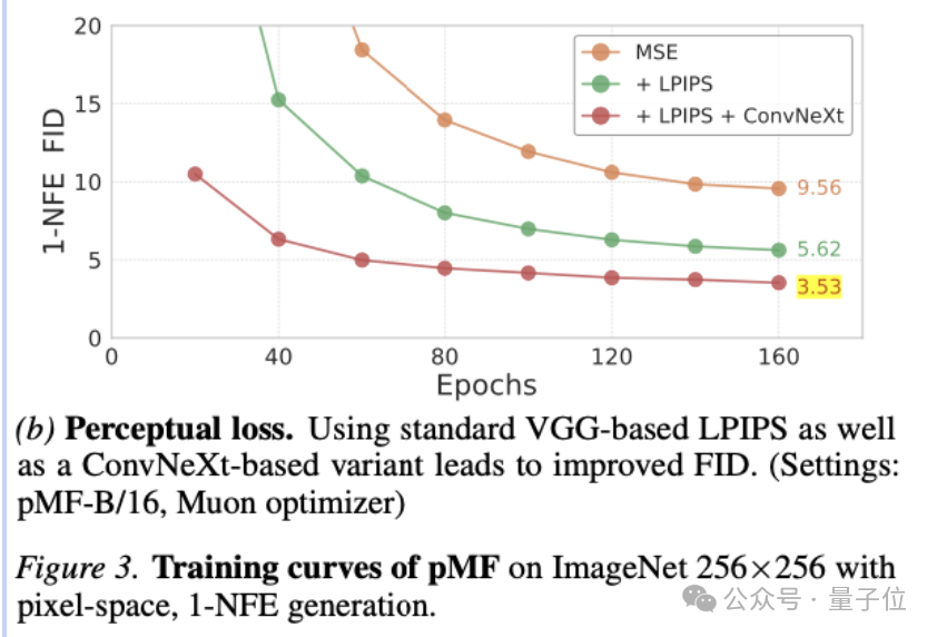 这本是潜空间方法在训练VAE时才能用的技巧,pMF把它带到了生成器本身的训练中。实实验显示,加入感知损失后,FID从9.56直接降到3.53,提升了约6个点。