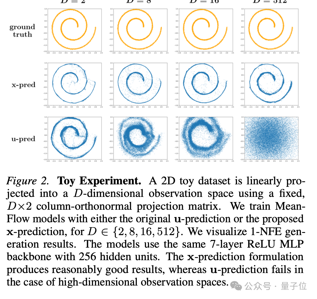 当把2D数据投影到512维观察空间时,传统的u-prediction直接崩溃,而x-prediction仍然能够正常工作。