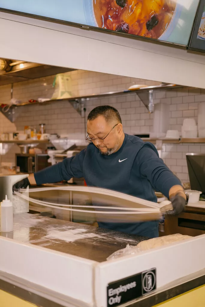 马瑞林在制作拉面,他来到纽约后,在由中国穆斯林经营的餐厅工作。