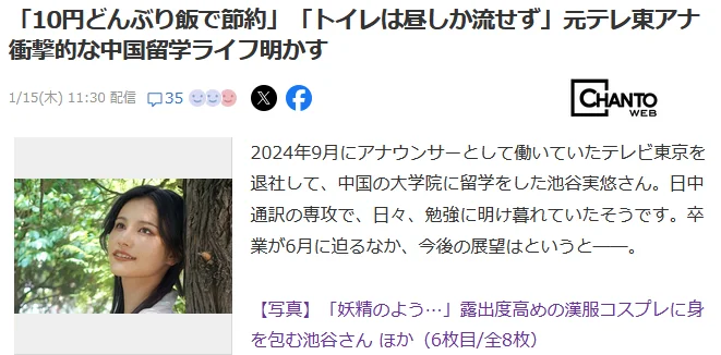 池谷实悠曾是日本东京电视台主播。2024年,她辞去工作,来到中国天津留学读研,6月份将毕业。近日,她分享了自己在中国的留学经历,经日媒报道后引发热议。