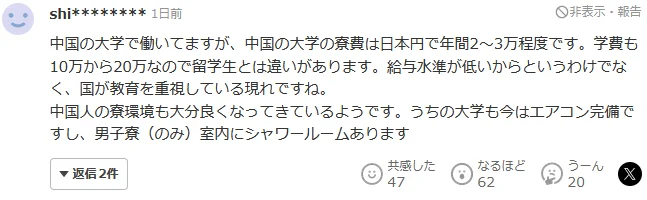 我在中国大学工作,中国大学的宿舍费每年大约是2万到3万日元。学费也是10万到20万日元不等,和留学生有所不同。这并不是因为工资水平低,而是国家重视教育的表现。