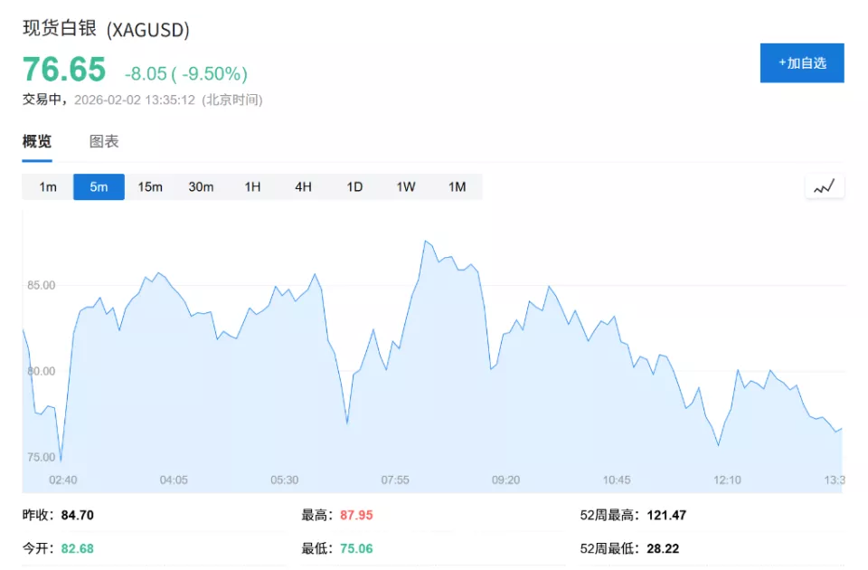 现货白银失守74美元/盎司,日内跌幅13.01%。