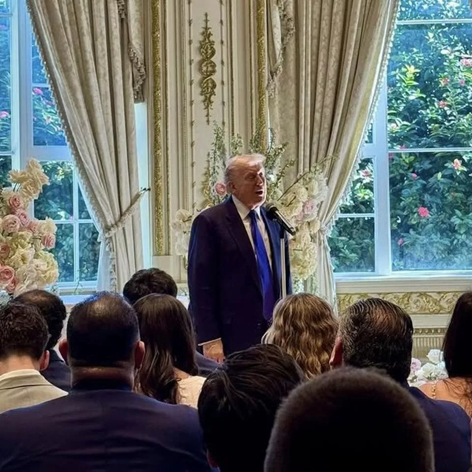 川普在婚宴上致词,给新人祝福。(X@SofDracopoulos)
