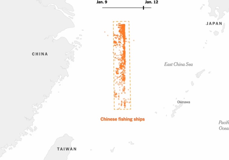 中国渔船这一个多月来两度在主要航道附近排出大规模船阵。去年12月25日,约2000艘渔船在东海排成倒L字形的两条平行线,每条长约290英里(约466.7公里);今年1月11日,约1400艘船又排成长约200英里(约321.8公里)的长方形。