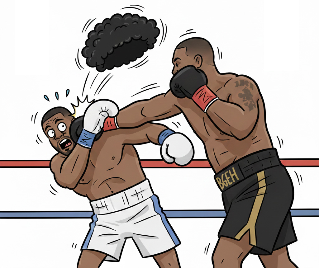 在这场对决中,37岁的Jarrell Miller正与对手Kingsley Ibeh展开肉搏。在对手一连串重拳的猛攻下,Jarrell Miller头上的假发套开始从前额处松动。到了回合结束时,他意识到这块“掩体”已经彻底跑位,但他并没有显得局促不安,反而对着镜头露出了淡定的笑容,随后潇洒地将假发套摘下并扔进了观众席。尽管遭遇了这种足以让大多数人尴尬到想挖地洞的时刻,Jarrell Miller依然保持了冷静的头脑,并最终通过分歧判定赢得了这场惊险的胜利。