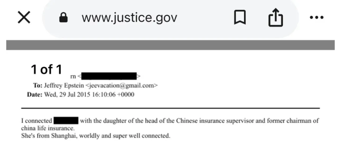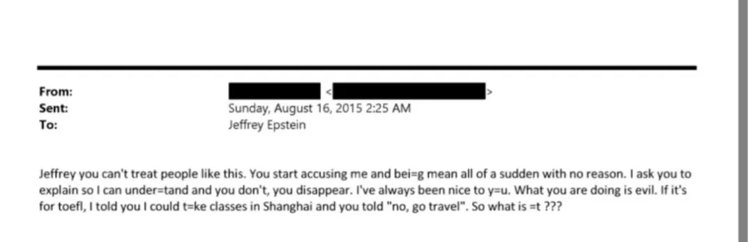 爱波斯坦和上海女大佬的风流往事曝光。。 2015年的某天,爱波斯坦到访上海并在上海停留3周之久(8月2号到8月25号号)。爱波斯坦让David介绍在上海的大佬,David介绍中国人寿保险yang**。 8月16号,疑似此女情绪失控,指责爱波斯坦玩失踪(此女大佬当时还在学托福,估计还是高中生)。。。 爱波斯坦的文件真是越挖越有。。。