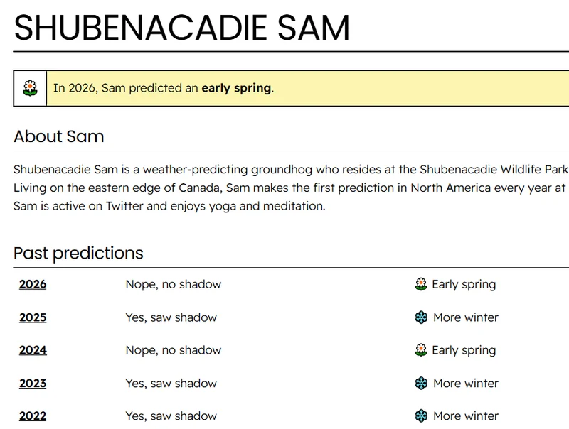 加拿大最知名的土拨鼠之一,新斯科舍省的 Shubenacadie Sam,则因天气原因取消了传统预测活动。省政府表示,由于预报显示将有另一场冬季风暴,吹雪可能导致前往Shubenacadie Wildlife Park(哈利法克斯以北约50公里)路况不安全,因此取消活动。省府称,由于Sam今天不会看到影子,按照民间说法,同样预示春天将提前到来。