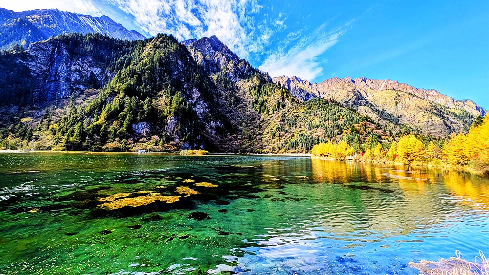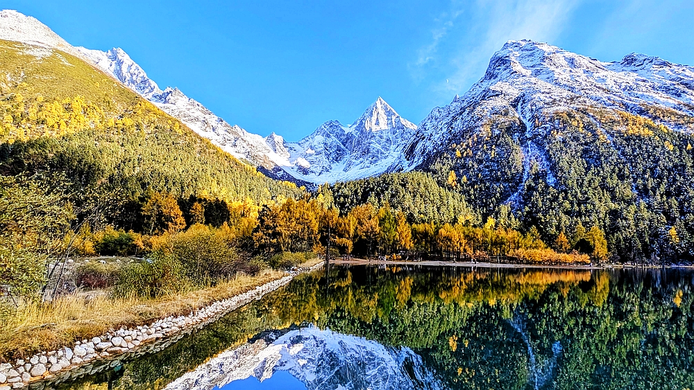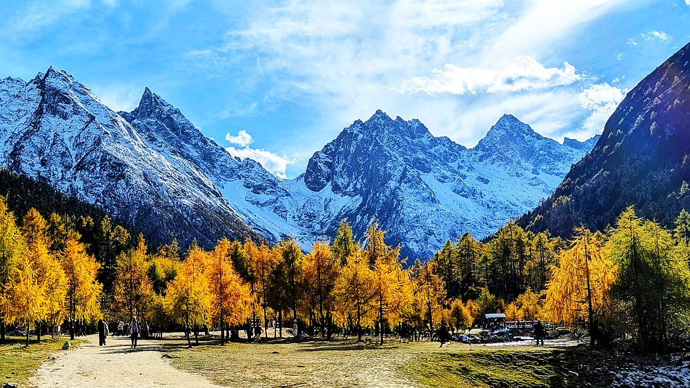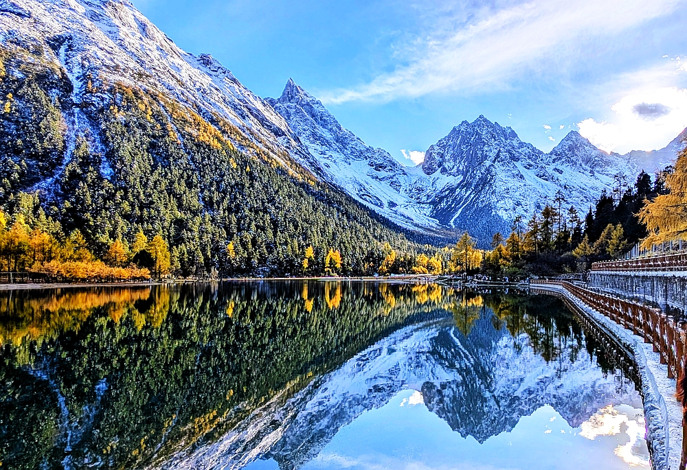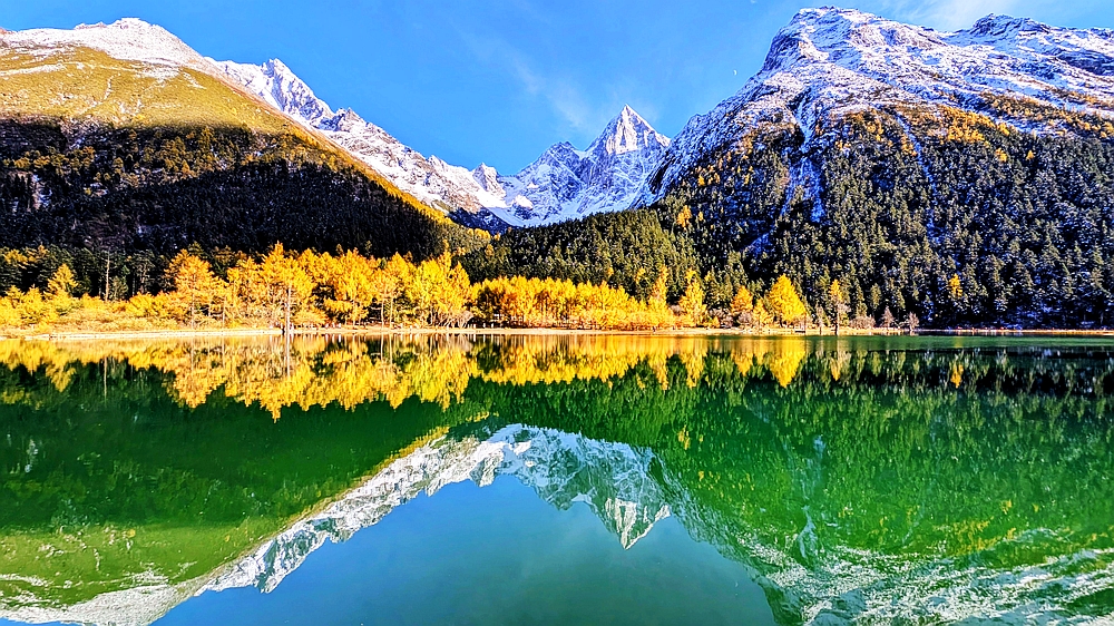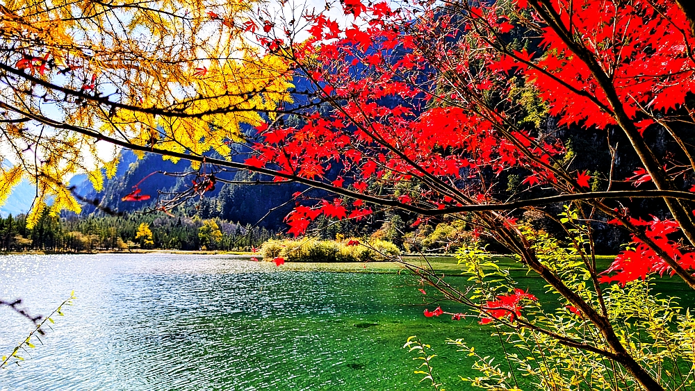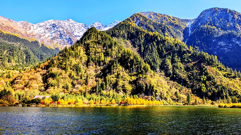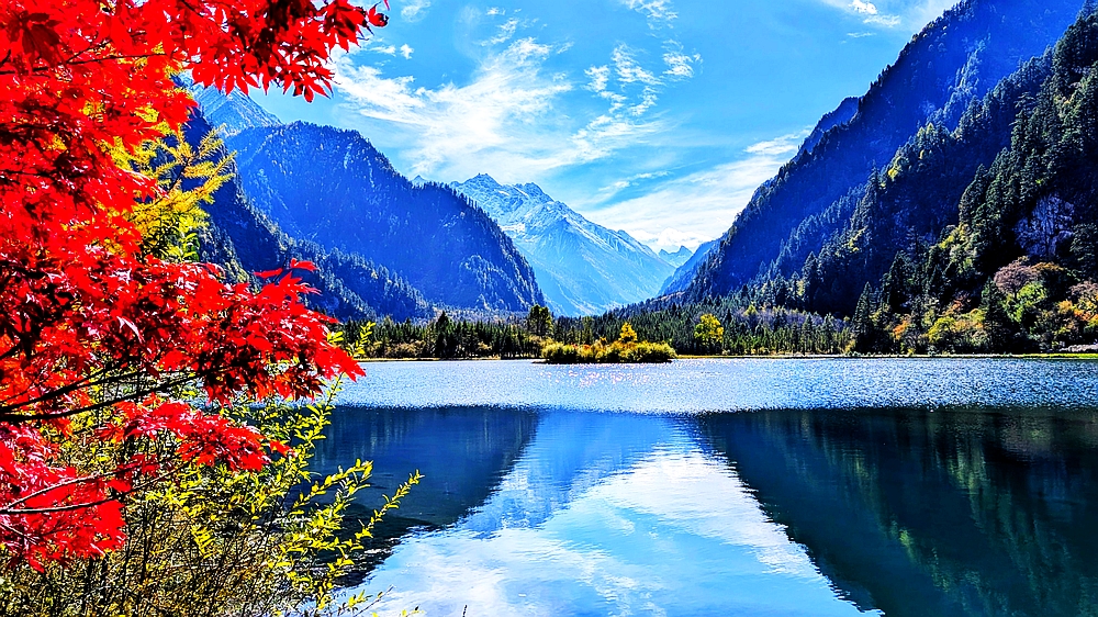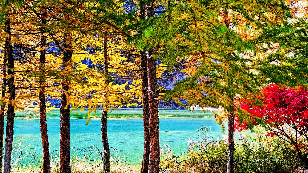 景区车从大门往景点开了很长时间。龙王海是第一站。龙王海是一个湖,湖边有金杉、青柏和枫树,背靠雪山。湖中倒影清晰。上车点在湖的另一边,我们绕湖走了大半圈,湖对面有很多火红的枫树,虽然不成片,但点缀在金杉和绿柏之中也很好看。