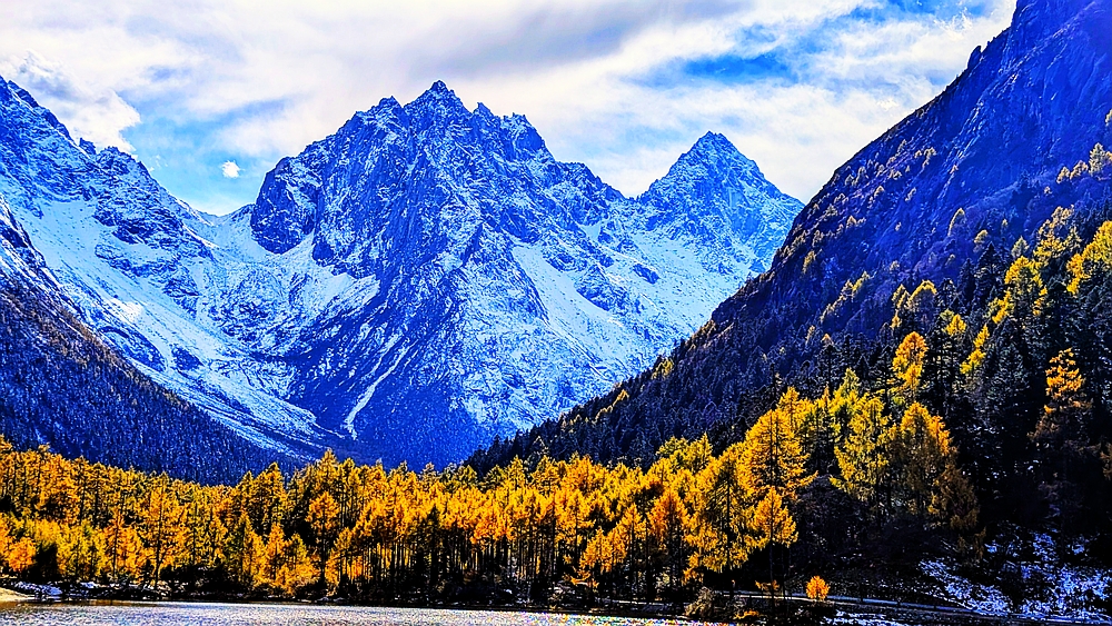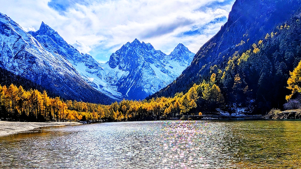 湖边金松,远处雪山,昨晚下雪,周遭的山都是斑白点染着青绿。