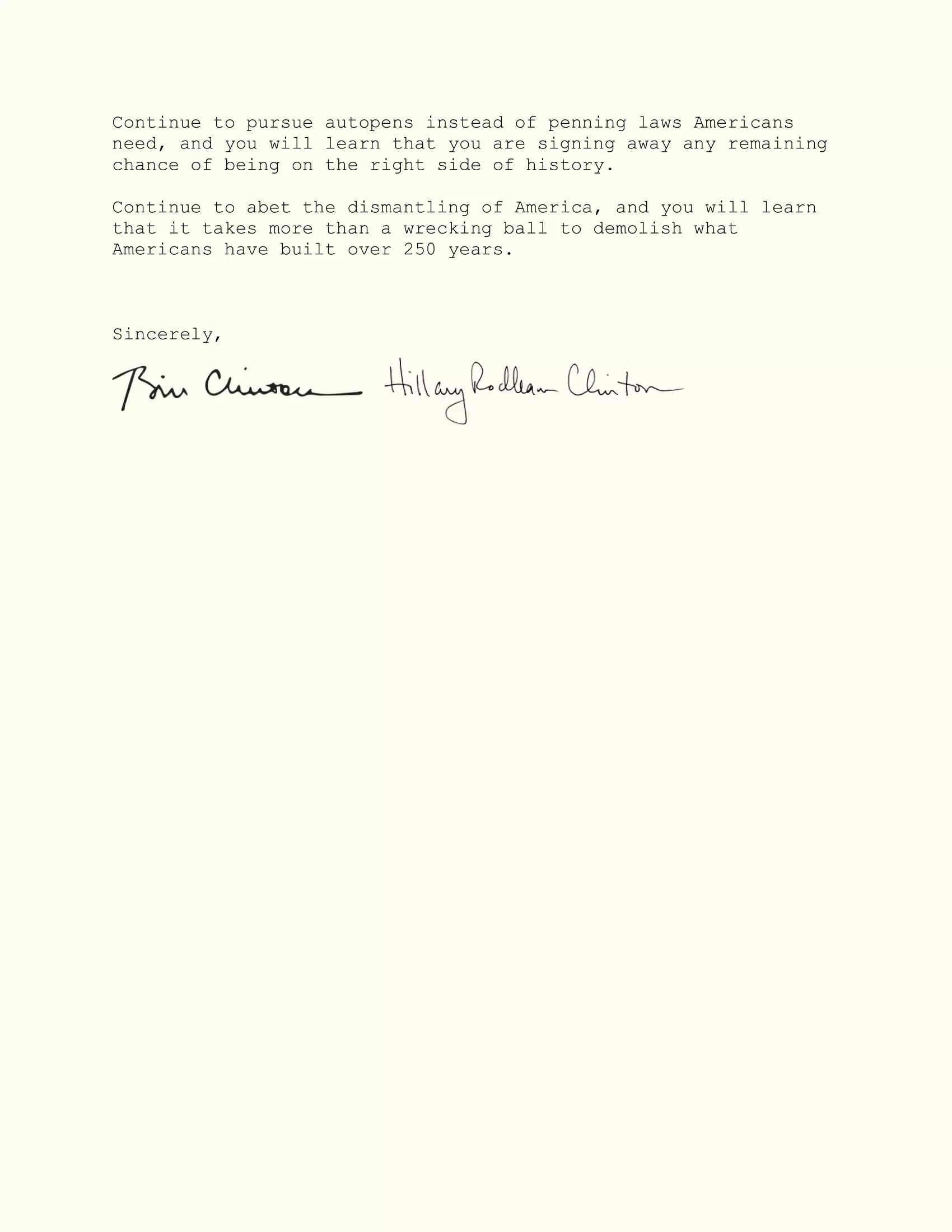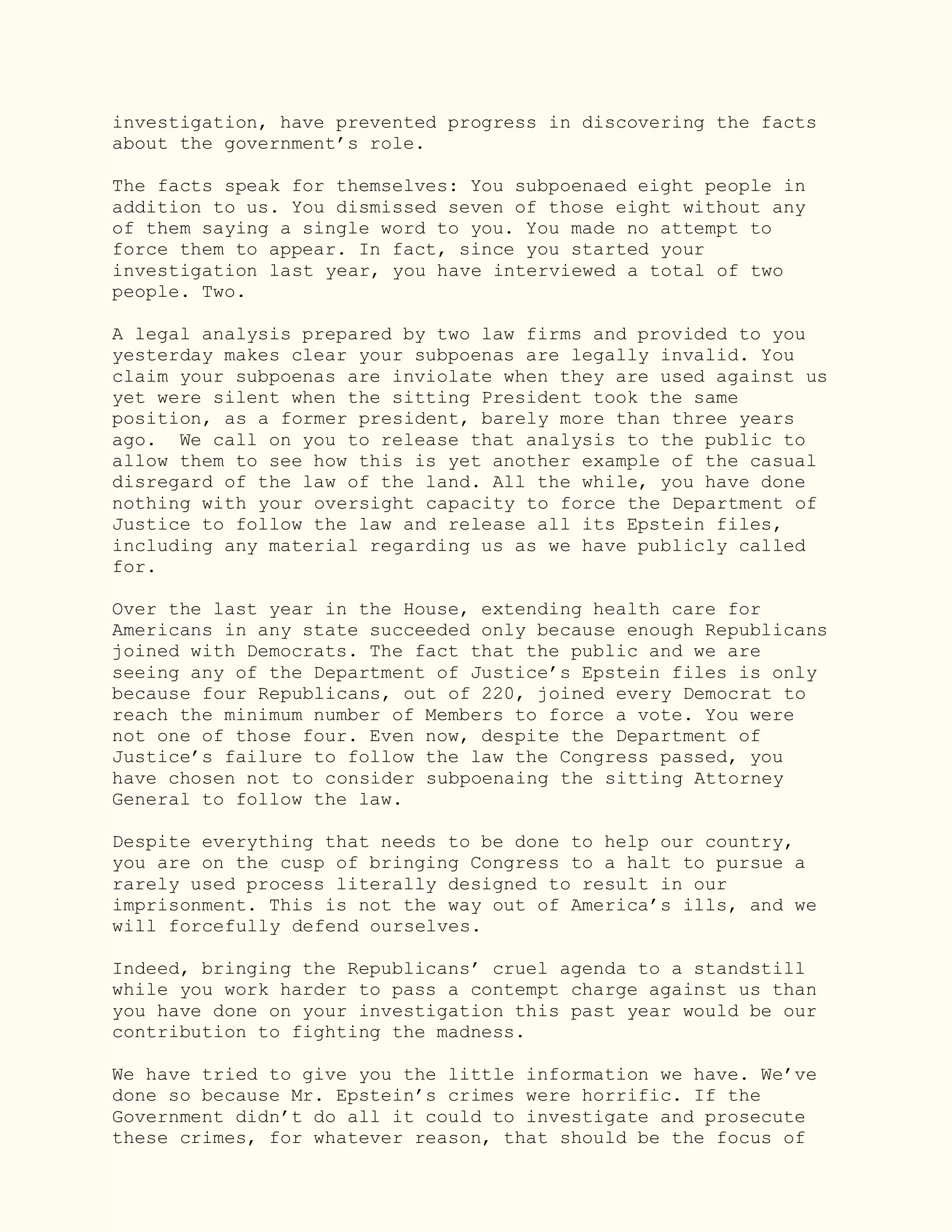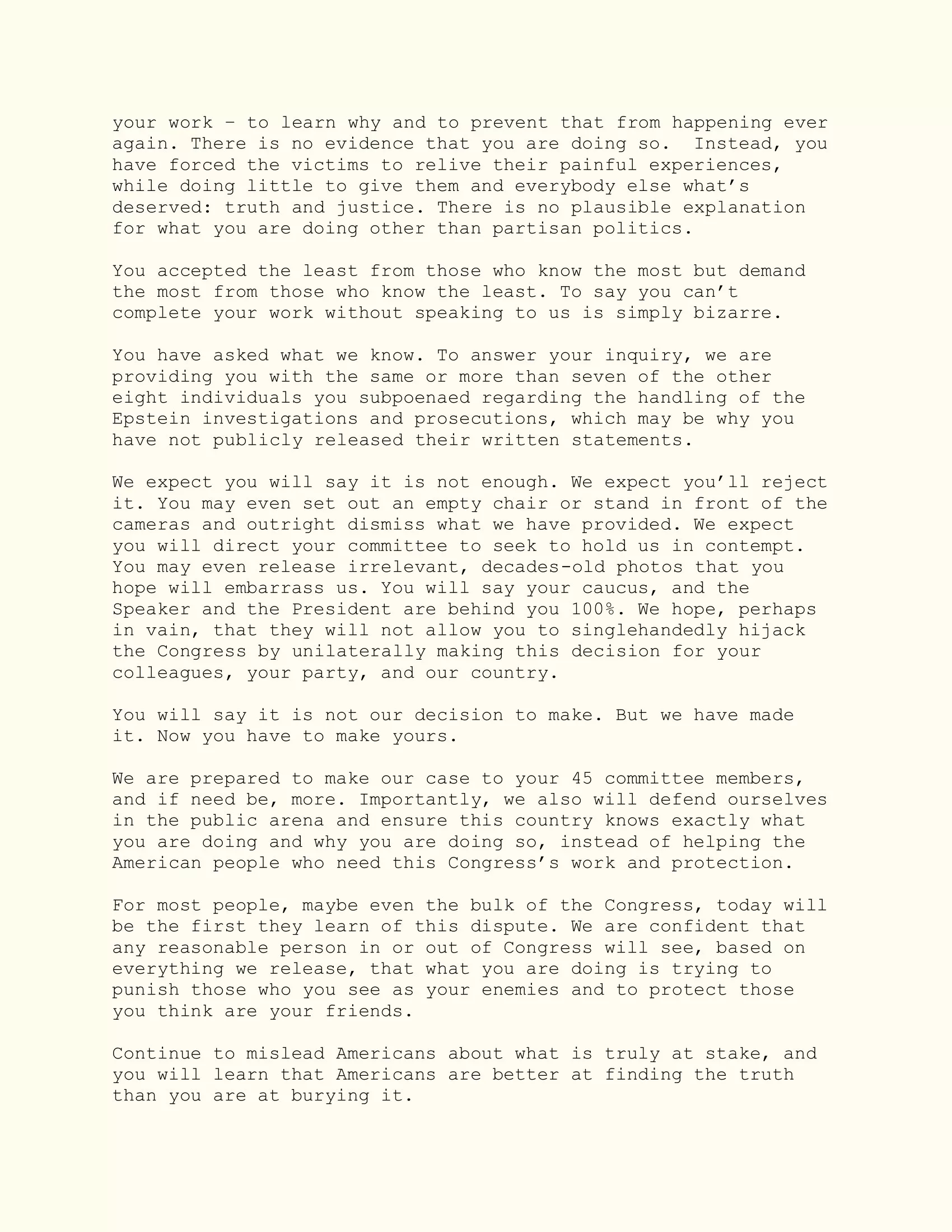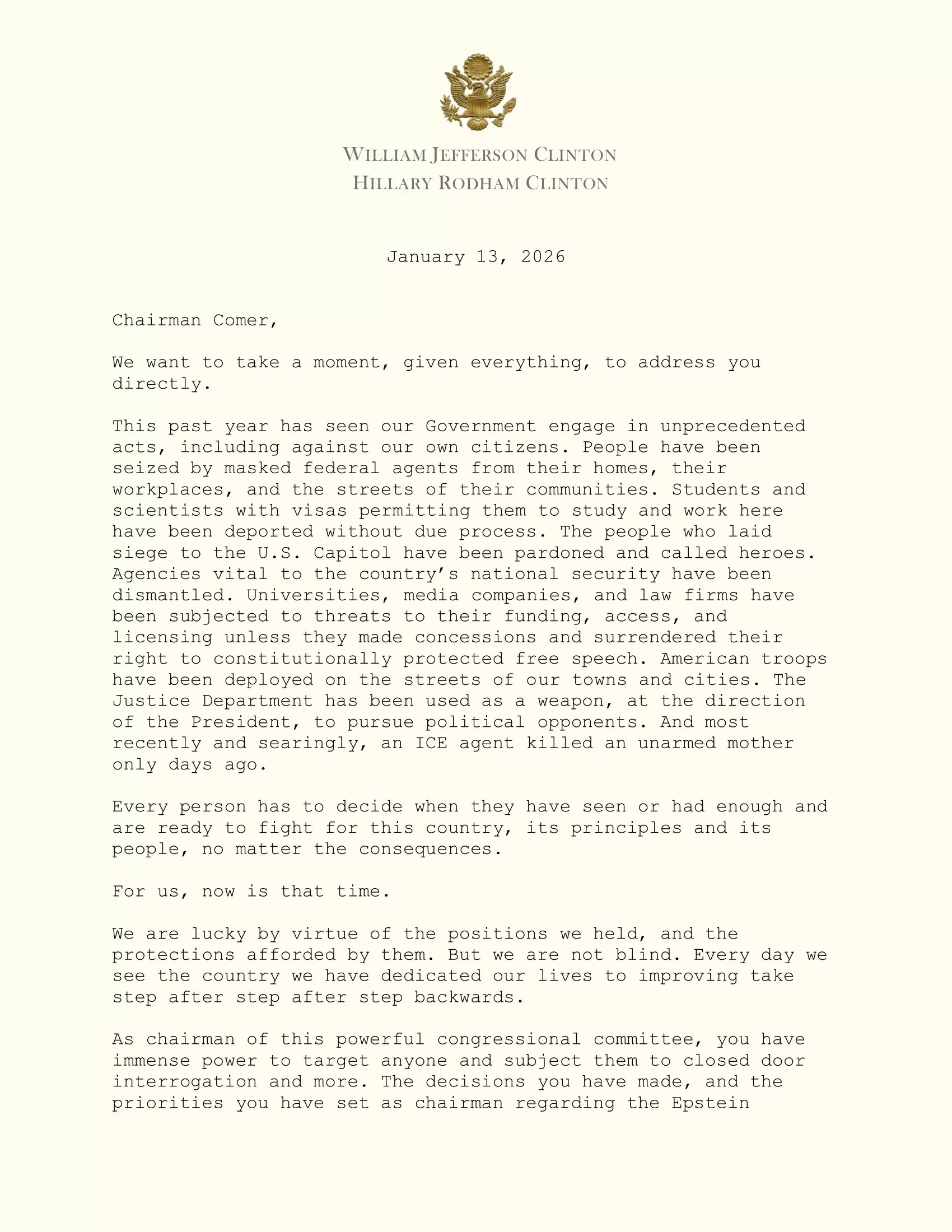 克林顿至今否认有任何不当行为,其发言人早前称克林顿在2006年爱泼斯坦被起诉前已与其断绝联系,且从未去过爱泼斯坦的私人岛屿。克林顿夫妇二人至今亦拒绝就爱泼斯坦调查出席国会听证,美国国会众议院预计本周将对克林顿夫妇进行藐视国会投票。