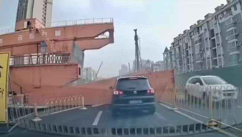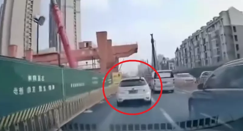 湖北省武汉地铁工地起重机倒塌,砸中旁边道路行驶中的白色轿车。(图撷自“@58cB4AdDMjKCsOJ”X帐号)