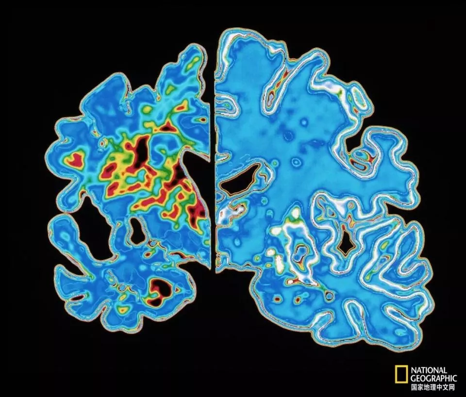这张对比图展示了阿尔茨海默病患者的大脑(左)与健康大脑(右)的差异。|国家地理图片集