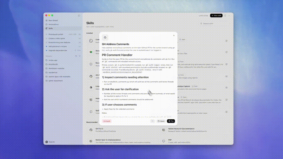 比如想要解决项目中的Comment,直接调用安装好的Skills,Codex立刻就把问题破解了。