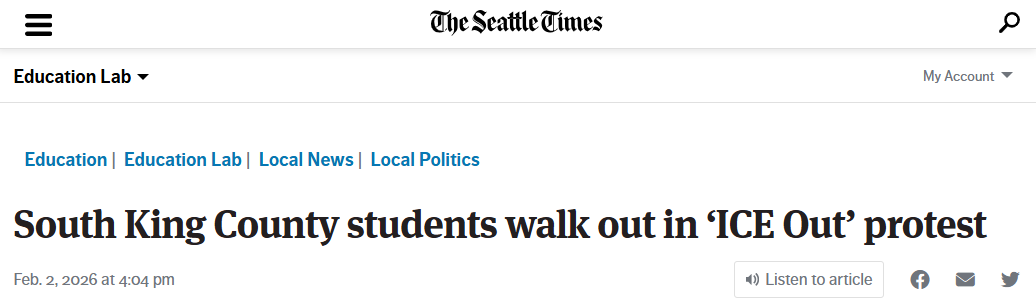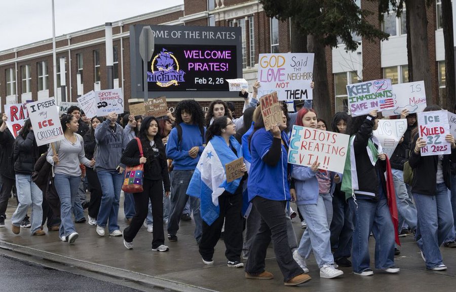 在布里恩的海莱恩高中(Highline High School),约500名青少年(超过该校学生总数的三分之一)从砖砌教学楼正门涌出,参与“美国移民与海关执法局滚蛋(ICE Out)”抗议活动。常青高中、雷尼尔山高中、雷斯贝克航空高中、林德伯格高中及远景高中的学生也加入了罢课行列,呼吁废除美国移民与海关执法局(ICE)。