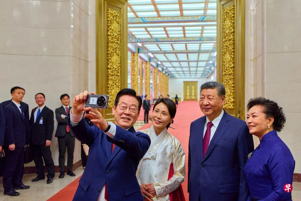 李在明用习近平赠送的小米智能手机为四人自拍 (法新社)