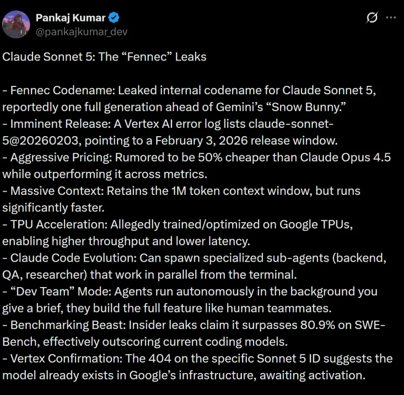 2月2日,X上一位的知名AI博主Pankaj Kumar (@pankajkumar_dev),爆料了Anthropic的下一代旗舰模型Claude Sonnet 5。