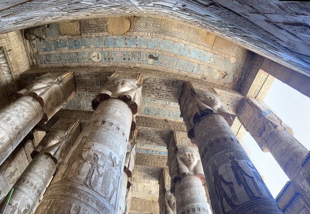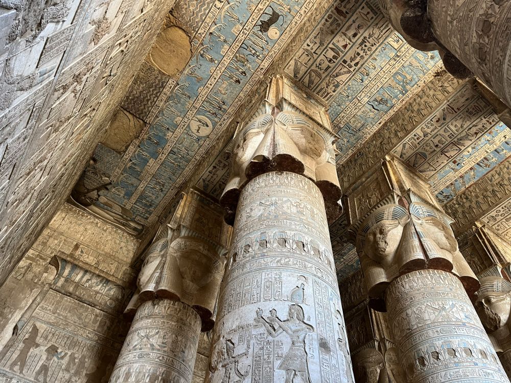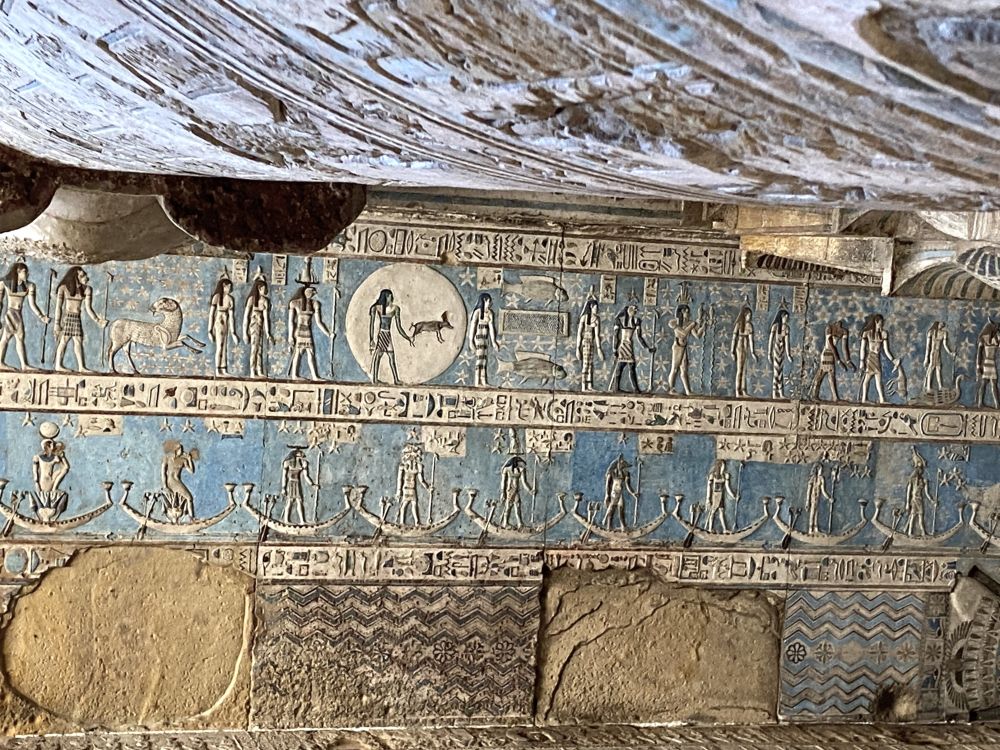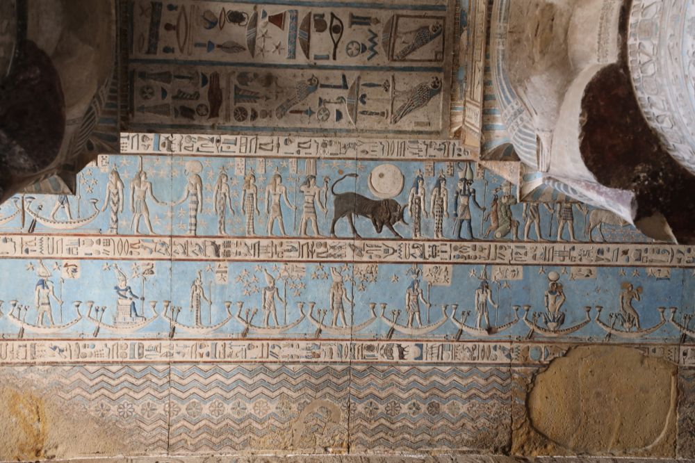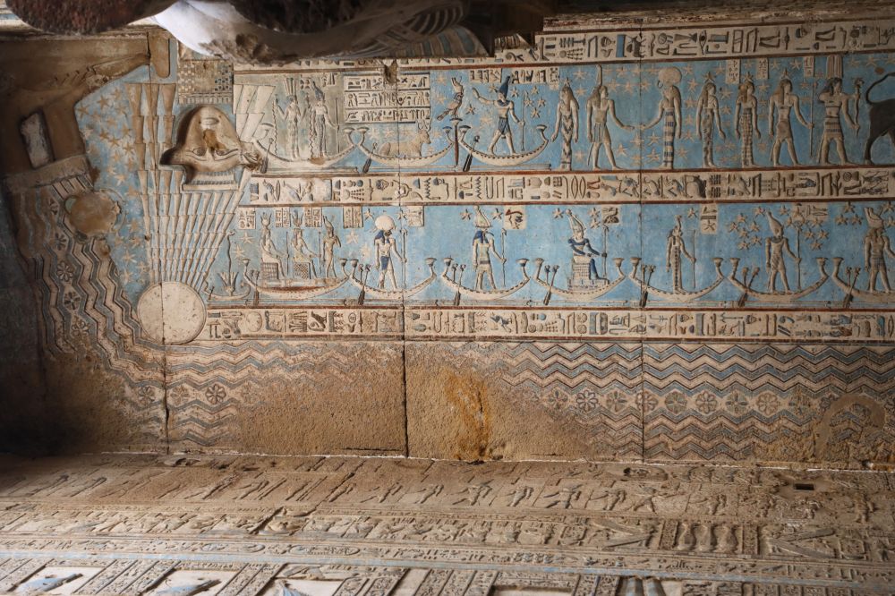 丹达拉神庙以其保存完好的彩绘天花板而闻名。深蓝色的天穹背景上,金黄色的星辰、神祇与各种天体符号熠熠生辉,即使历经两千多年的时光流转,色彩依然明亮生动,令人由衷震撼。
