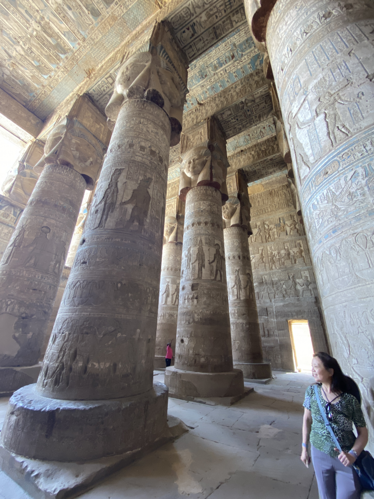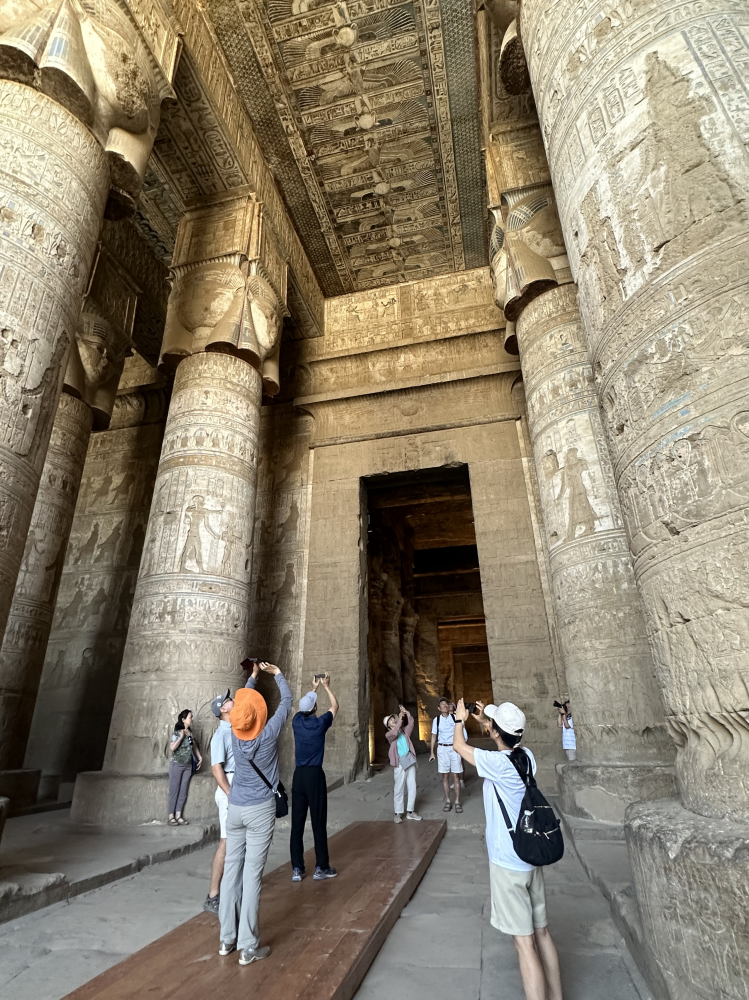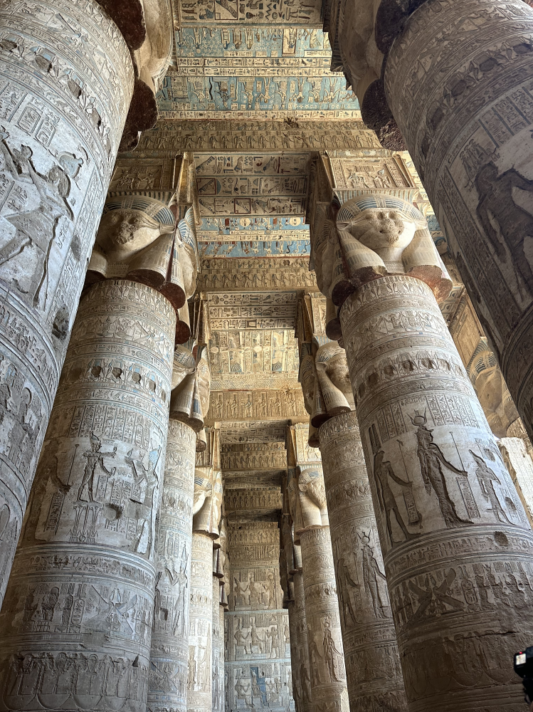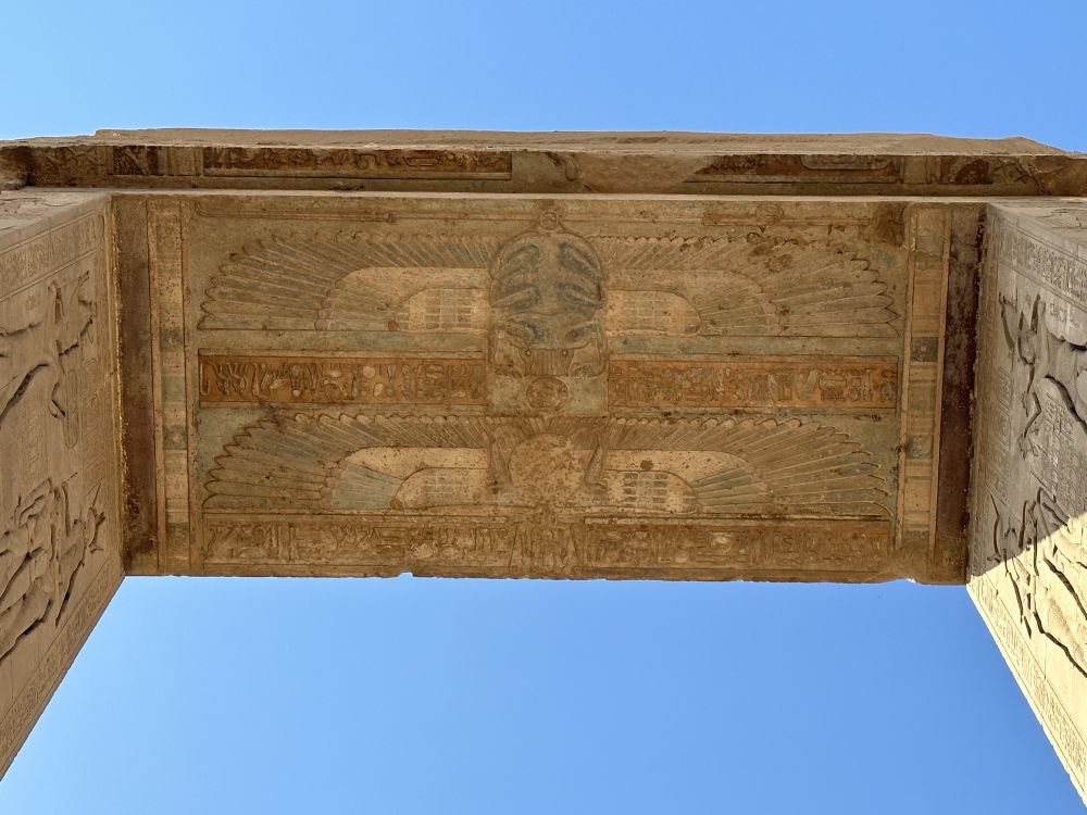 丹达拉神庙以其保存完好的彩绘天花板而闻名。深蓝色的天穹背景上,金黄色的星辰、神祇与各种天体符号熠熠生辉,即使历经两千多年的时光流转,色彩依然明亮生动,令人由衷震撼。