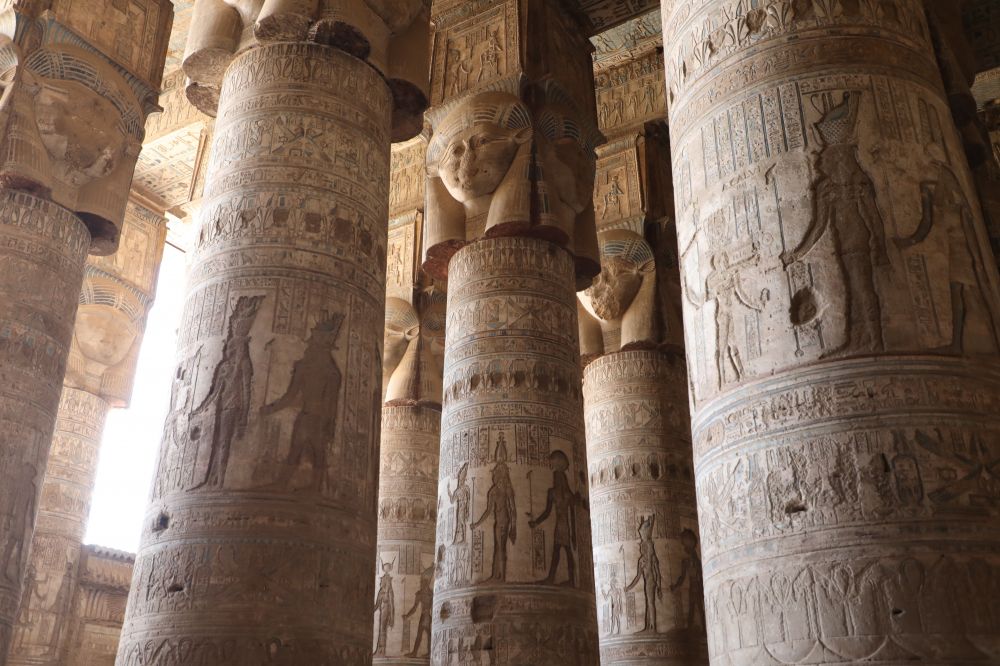 神庙最醒目的标志,是前殿中24根巨柱顶部的哈托尔四面头像柱头。女神面容宁静端庄,四向对称、造型优美,极具辨识度。这种柱头设计在古埃及建筑中极为罕见,也成为丹达拉神庙最具代表性的艺术符号之一。