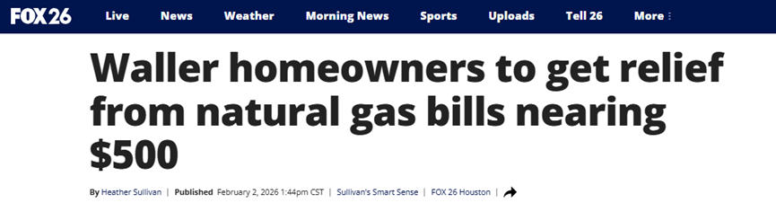沃勒(Waller)部分业主近日饱受高额天然气账单困扰,如今终于迎来喘息之机。