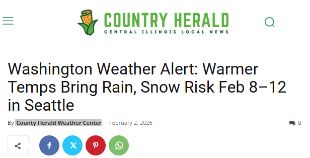 从2月8日至2月12日,华盛顿州预计将迎来更为潮湿且逐渐温和的天气模式,全州范围内(包括西雅图地区)降雨和山区降雪的可能性将随之增加。