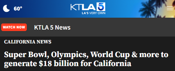 仅一周之后,洛杉矶将举办NBA全明星赛,预计将为洛杉矶周边地区带来至少2.5亿美元的经济收益。与此同时,沙加缅度将于6月在加州博览中心(Cal Expo)举办2026年极限运动会(2026 X Games),为期三天的赛事预计每天将吸引约3.5万名观众。