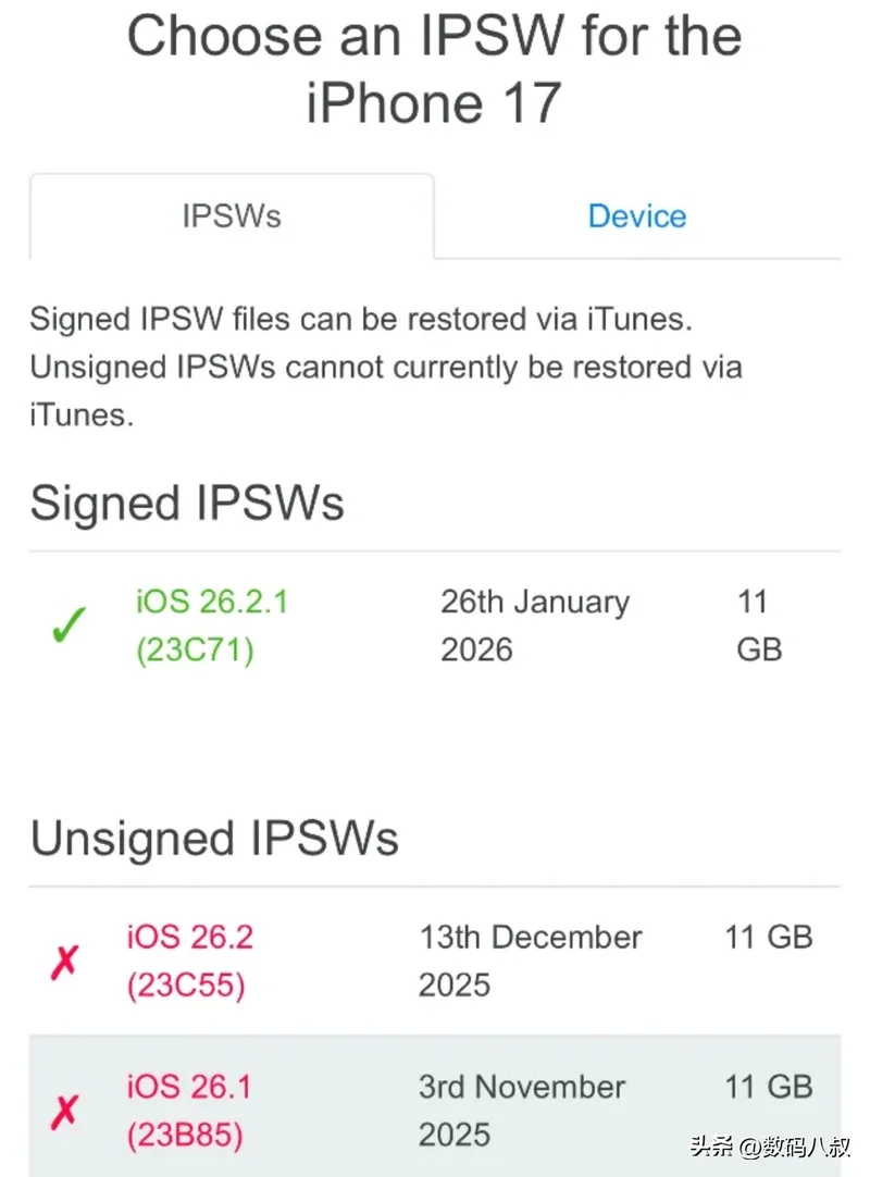 果粉圈今日迎来双重重磅消息:苹果正式关闭iOS 26.2系统验证通道,上周刚升级至iOS 26.2.1的用户彻底失去降级“退路”。这一操作遵循苹果惯例——新版推送一周后停签旧版,此次不仅锁定iOS 26系列,更同步关闭了iOS 12.5.7、iOS 15.8.5等多款老旧系统验证,覆盖不同年代iPhone设备,标志着这些版本正式退出官方可安装序列 。对普通用户而言,验证关闭意味着升级需谨慎,一旦更新至iOS 26.2.1,若遇卡顿、续航缩水等适配问题,将无法通过官方渠道回退。