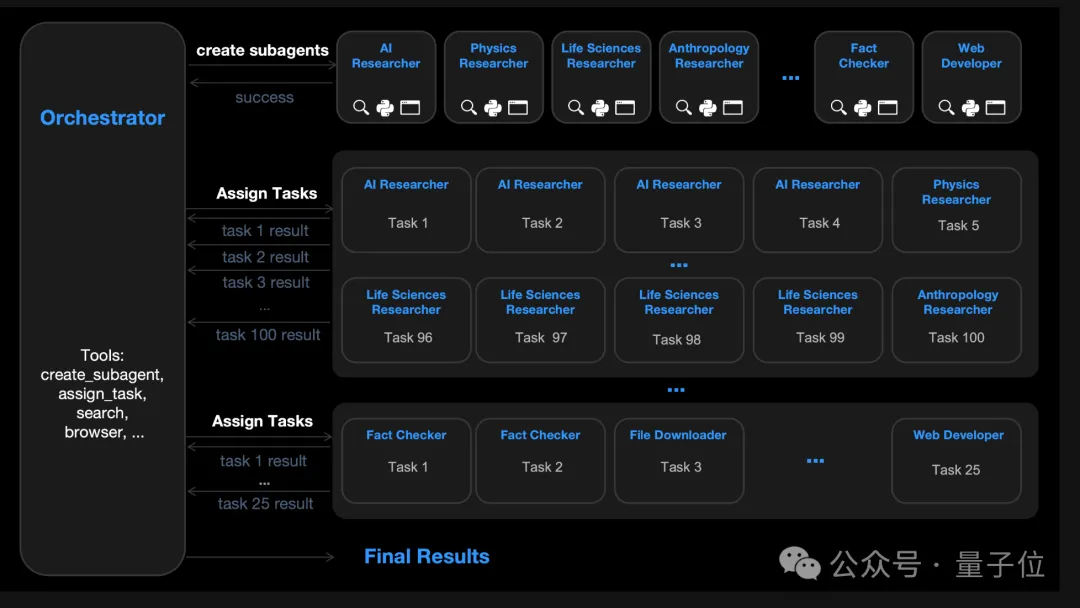 这是一套能自主构建百人规模数字化团队的并行系统,让模型获得了“分身”能力,可以瞬间创建并编排多达100个子智能体,并支持调用1500个工具的并行工作流。