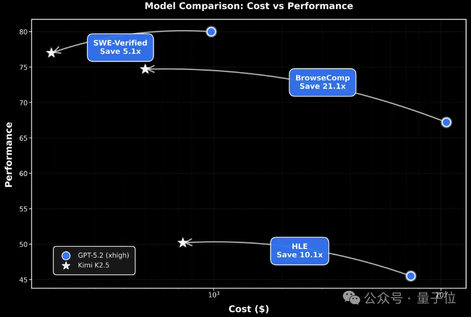 而且极具性价比,在BrowseComp上达到比GPT-5.2更高的表现,Kimi K2.5的资金消耗仅有不到5%。