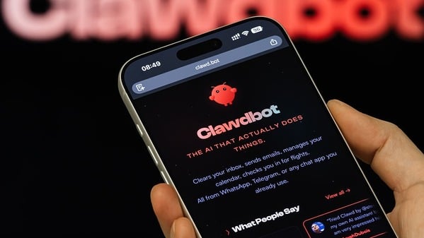智能手机上显示的 Clawdbot 网站首页,背景为 Clawdbot 标志。(图片来源:Cheng Xin/Getty Images)