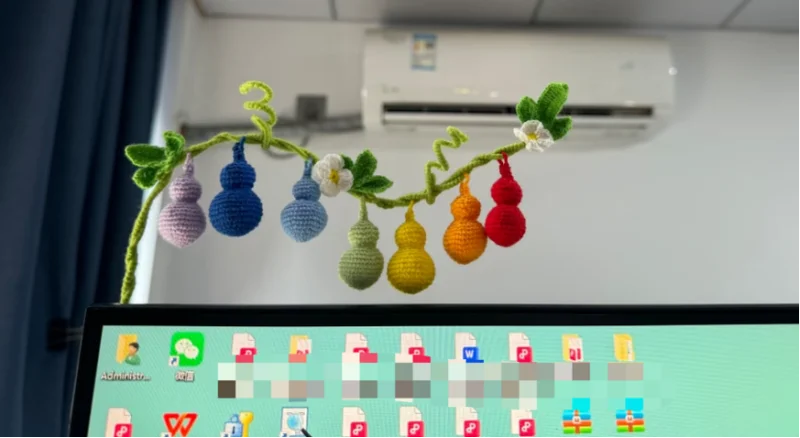 网友在工位上摆出自己织的葫芦藤与葫芦。(图/@喵喵星玩毛线)