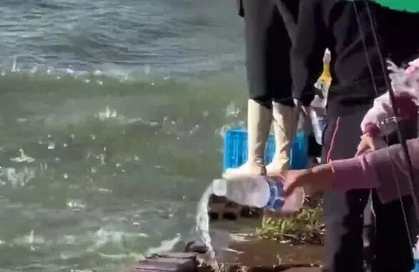 相关视频中,放生者将矿泉水倾入湖水中。/荔枝新闻