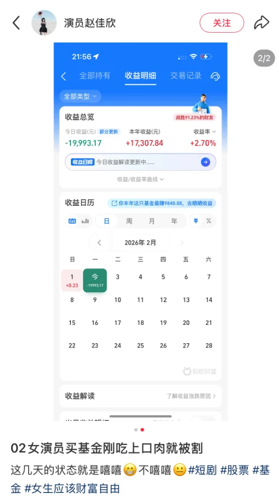 2月2日,赵佳欣再度更新动态,晒出的收益页面显示亏损19993.17元。她坦言:“前天还在沾沾自喜,昨天就回调了”,更直言“买基金刚吃上口肉就被割,这几天的状态就是嘻嘻不嘻嘻”。