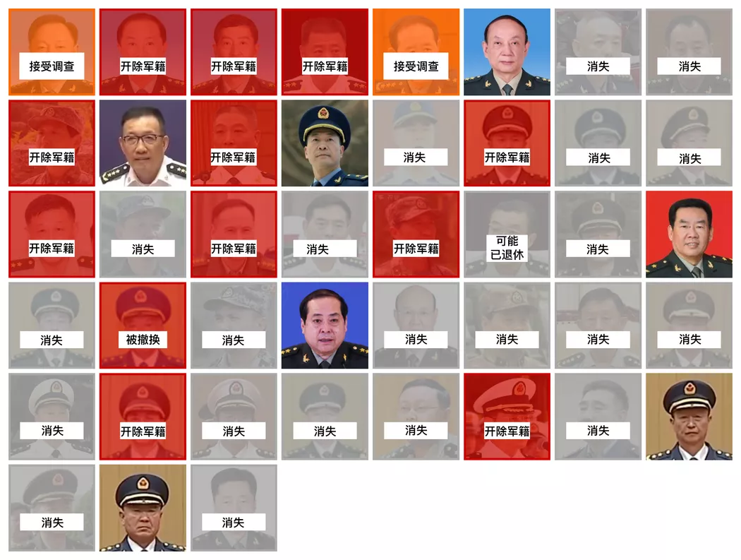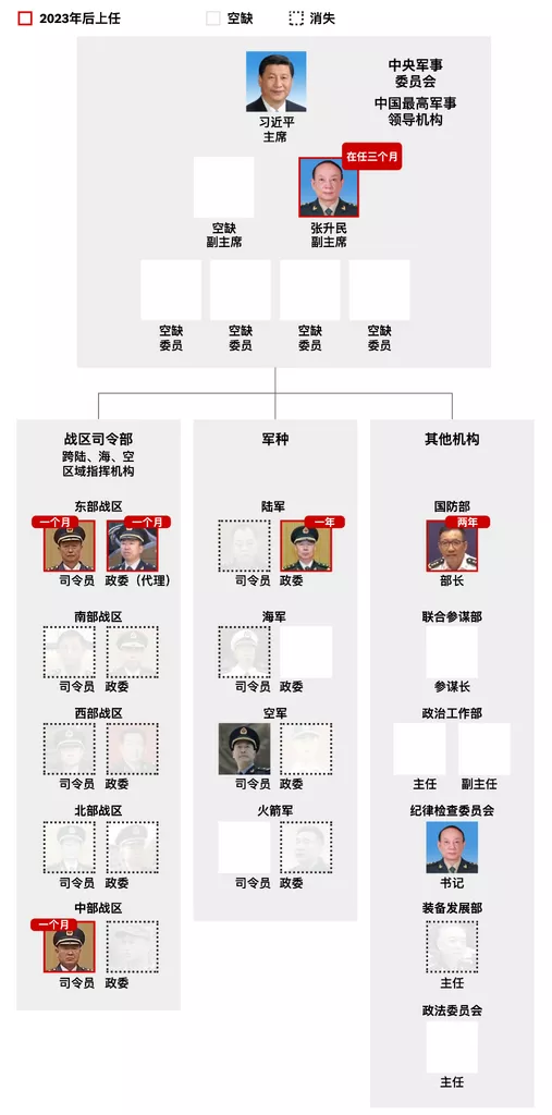 军队指挥层多数职位空缺或由新人接任。 注:图表未涵盖中国人民解放军内的所有机构。凡被标注为“空缺”的职位均指相关将领已被正式免职或停职,且尚未宣布继任者或临时代理人。