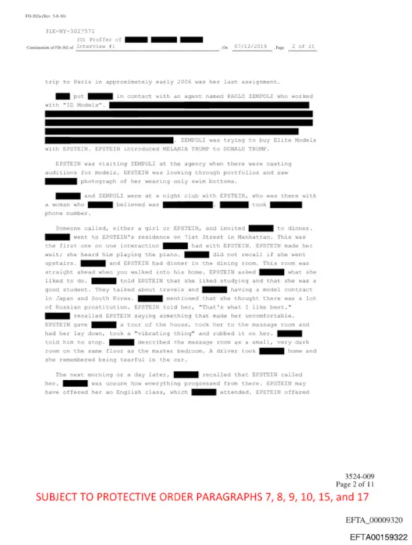 报道称,这一对特朗普夫妇相识缘起的爆炸性供述,出现在2019年11月的一份FBI记录中。该文件详细记录了当年7月对一名姓名被隐去、并获得豁免权以接受询问的女性的访谈。文件有大量涂黑内容,且显示这名女性不仅被视作性侵受害者,还作为证人披露了爱泼斯坦在其私人岛屿上实施系统性性侵的骇人细节。