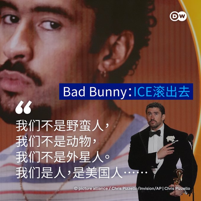 除了碧梨外,另一位今年的格莱美大赢家、人气偶像Bad Bunny(“坏兔子”)也在发表领奖感言时说:“在感谢上帝之前,我要说‘ICE滚出去’。”这博得了全场掌声。他继续说,“我们不是野蛮人,我们不是动物,我们不是外星人。我们是人,是美国人……”