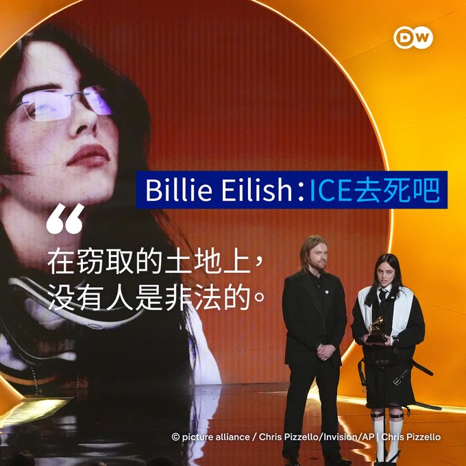 “在窃取的土地上,没有人是非法的,” Billie Eilish(“碧梨”)在领奖时说道。她还爆粗说:“ICE(美国移民(专题)及海关执法局)去死吧。……我们需要继续抗争,继续发声。我们的声音很重要。”