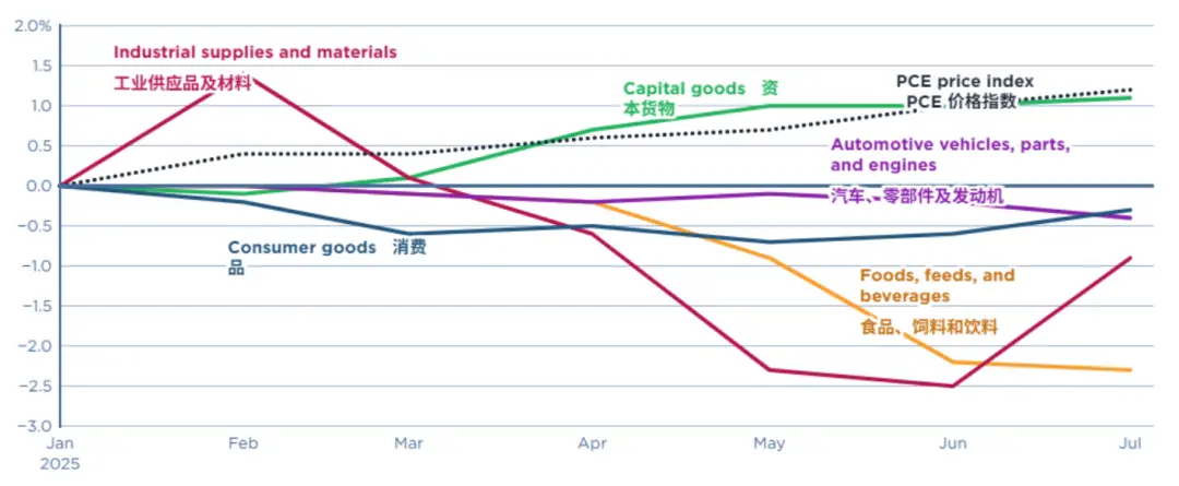 图6:2025年1月-7月各大类商品到岸价(CIF)进口价格累计变化与个人消费支出PCE累计变化