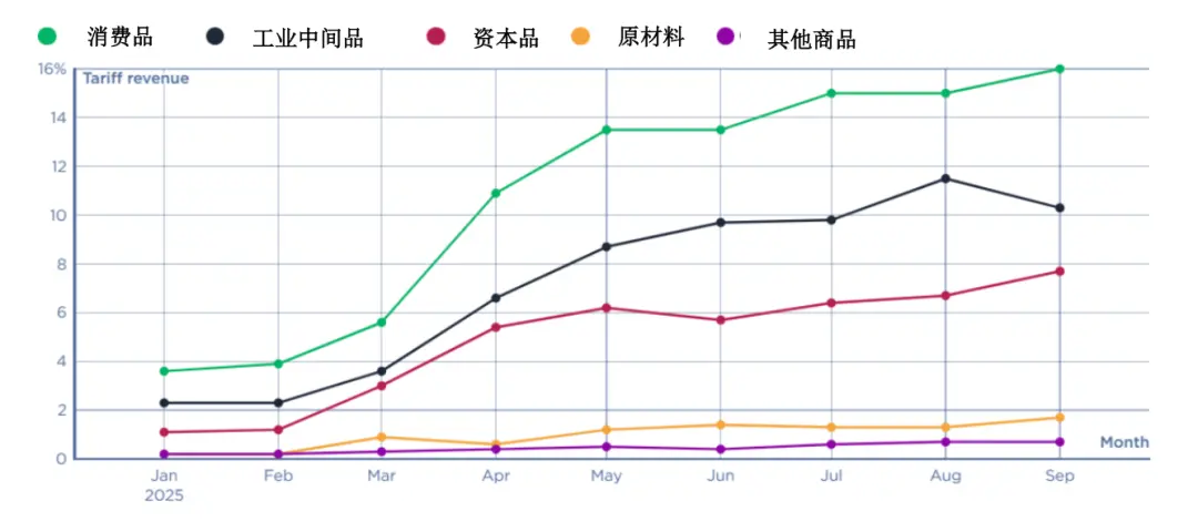 总体而言,进口商品的价格上涨和对国内商品价格的溢出效应对整体CPI贡献了0.7个百分点的增幅。值得注意的是,对照约19.9%的适用关税税率,3月到9月间关税到零售价格的传导率约为20%,显示关税影响对零售商品价格的传导显著但远不完全[24]。