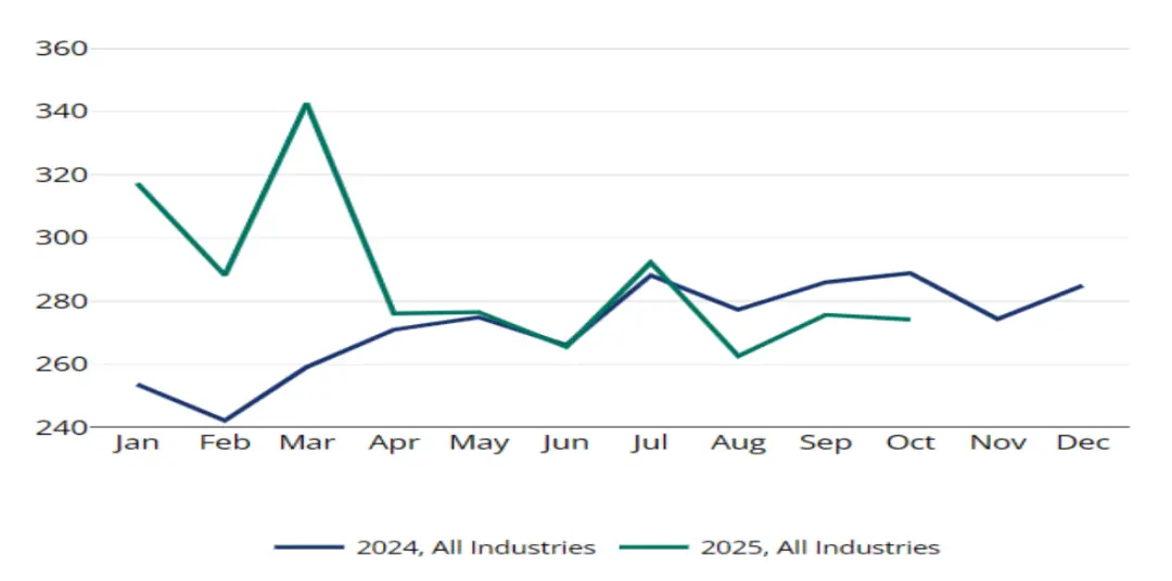 图4:2024年11月-2025年10月美国所有工业品进口额对比(十亿美元)