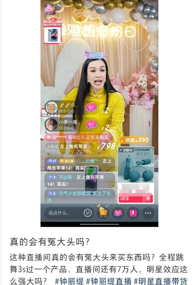 但她似乎只在《浪姐》唱跳节目上敬业,带货却不太敬业,卖货直播就是不停的跳操,网友吐槽她展示货品的时间还没她跳操的时间长。